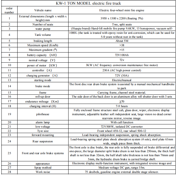 KW-1 tonnin malli sähköinen paloautoSe on tärkeä lisä perinteiselle palontorjuntajärjestelmälle, joka sopii erityisesti alkuperäiseen palontorjuntaan, kapeisiin ympäristöihin ja päivittäiseen ehkäisyyn. Se on ympäristöystävällinen, taloudellinen ja käytännöllinen ja sopii ylennykseen yhteisöissä, luonnonkauniissa paikoissa, teollisuuspuistoissa ja muissa skenaarioissa.