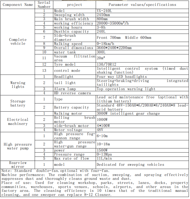Käyttöpaikka: Käytetään työpajan, puistojen, kadujen, kaistojen, telakoiden, kiinteistöjen, varastojen, urheilupaikkojen, koulujen, lentokenttien ja muiden alojen puhdistamiseen. Puhdistustehokkuus on 10-kertainen perinteisen manuaalisen kärjessä, ja yksi lakaisukone voi korvata 8-12 puhdistusaineen.